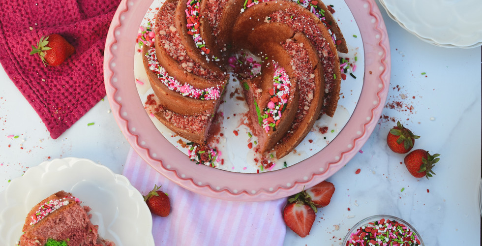**(If you don't plan to make cake strawberries for inside the cake. Add strawberry pureé to large bowl. Add additional ½ cup of flour to flour mixture. Slowly add the flour mixture one third at a time with half of buttermilk. Beginning and ending with flour mixture. Mix until fully combined but be careful not to over mix. Transfer batter to the bundt cake pan and smooth batter until even in the pan. Hit cake pan onto the counter a few times to knock out air bubbles. Bake cake for approximately 40-45 minutes until toothpick or cake tester comes out clean. )