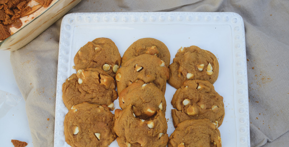 In a large separate bowl, using either hand or stand mixer, cream together butter and brown sugar. Cream butter and sugar together until butter is pale yellow and doubled in size. Add sweet potato. Add eggs one at a time. Mix until smooth. Add vanilla extract. Add half of flour mixture to cream mixture and stir until incorporated. Add second half of flour mixture. Stir until incorporated. Add white chocolate chips and cheesecake bites (optional) to batter. Slowly fold in until combined.